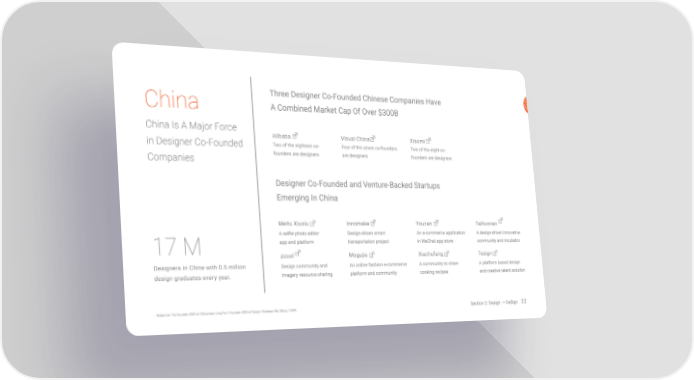 Three Designer Co-Founded Chinese Companies Have China A Combined Market Cap Of Over $300B China Is A Major Force Alibaba Visual China Xiaomi in Designer Co-Founded Two of the eighteen co- Four of the seven co-founders Two of the eight co- Companies founders are designers are designers founders are designers Designer Co-Founded and Venture-Backed Startups Emerging In China Meitu Xiuxiu Innomake Youzan Taihuonao A selfie photo editor Design-driven smart An e-commerce application A design-driven innovative 17 M app and platform transportation project in WeChat app store community and incubator zcool Mogujie Xiachufang Tezign Designers in China with 0.5 million Design community and An online fashion e-commerce A community to share A platform based design design graduates every year. imagery resource sharing platform and community cooking recipes and creative talent solution Haibo Lei / Co-founder+CEO at Taihuoniao, Ling Fan / Founder+CEO of Tezign, Professor Min Wang / CAFA Section 2: Design → De$ign 22