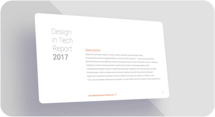 Design in Tech Report Observations Design isn’t just about beauty; it’s about market relevance and meaningful results. 2017 At top business schools, design thinking is moving into the curriculum — driven by market demand. Both McKinsey & Co and IBM have recently made appointments at their most senior levels for designers. Adopting an inclusive design approach expands a tech product’s total addressable market. Computational designers remain in demand at technology companies of all sizes and maturity levels. Chinese design in tech principles and practices are leading the world, but are often overlooked. Design tool companies and design community platforms occupy new positions of value for tech. Voice- and chat-based interfaces are grounded in mental models that don't require a visual representation. https://designintechreport.wordpress.com 4