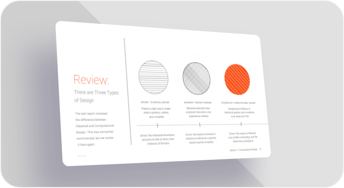 Review: There are Three Types of Design DESIGN: “CLASSICAL DESIGN” BUSINESS: “DESIGN THINKING” TECHNOLOGY:“COMPUTATIONAL DESIGN” There’s a right way to make Because execution has Designing for billions of The last report reviewed what is perfect, crafted, outpaced innovation, and individual people and in realtime, and complete experience matters is at scale and TBD the difference between Classical and Computational Design. This was somewhat controversial, but we review Driver/ the Industrial Revolution, Driver/ the need to innovate in Driver/ the impact of Moore’s and prior to that at least a few relation to individual customer Law, mobile computing, and the it here again. millennia of ferment. needs requires empathy. latest tech paradigms. @johnmaeda Section 1: Computational Design 6