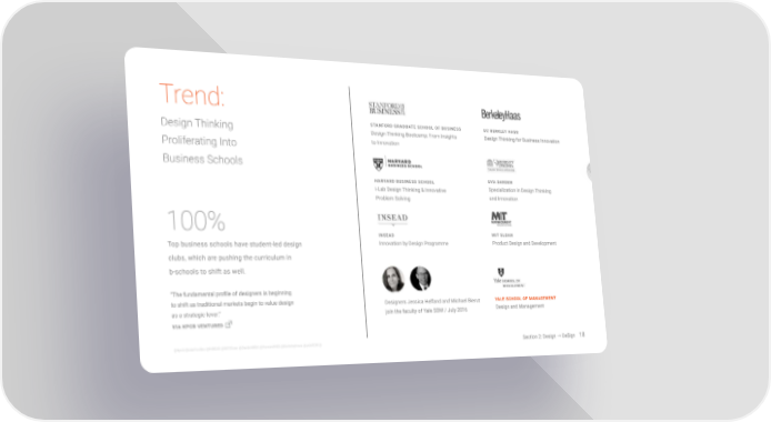 Trend: Design Thinking STANFORD GRADUATE SCHOOL OF BUSINESS UC BERKLEY HASS Design Thinking Bootcamp: From Insights Design Thinking for Business Innovation Proliferating Into to Innovation Business Schools HARVARD BUSINESS SCHOOL UVA DARDEN i-Lab Design Thinking & Innovative Specialization in Design Thinking Problem Solving and Innovation 100% INSEAD MIT SLOAN Top business schools have student-led design Innovation by Design Programme Product Design and Development clubs, which are pushing the curriculum in b-schools to shift as well. “The fundamental profile of designers is beginning to shift as traditional markets begin to value design Designers Jessica Helfand and Michael Bierut YALE SCHOOL OF MANAGEMENT as a strategic lever.” join the faculty of Yale SOM / July 2016 Design and Management VIA KPCB VENTURED @kpcb @stanfordbiz @INSEAD @MITSloan @DardenMBA @HarvardHBS @BerkeleyHaas @yaleSOM @ Section 2: Design → De$ign 18