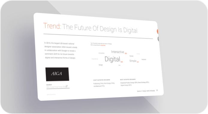 Trend: The Future Of Design Is Digital In 2016, the largest US-based national Top 10 words to describe the Future of Design Size is proportional to popularity designer association AIGA issued a study in collaboration with Google to reveal a Interactive 300 Innovative Exciting sentiment shift for its future towards Human digital and interactive forms of design. Experience Digital Simple Inclusive 605 231 Design Clean LEAST SATISFIED DESIGNERS MOST SATISFIED DESIGNERS SOURCE Publishing (74%), Print Design (74%), Industrial/Product Design (83%), Brand Strategy (82%), AIGA x Google Design Census 2016 Architecture (71%) Digital Design (82%) @AIGA @GoogleText Section 3: Design needs Designers 25