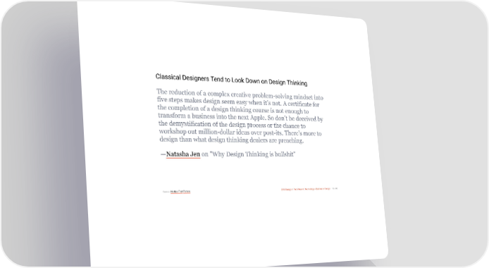 3/10/2018 2018 Design In Tech Report Classical Designers Tend to Look Down on Design Thinking The reduction of a complex creative problem-solving mindset into five steps makes design seem easy when it’s not. A certificate for the completion of a design thinking course is not enough to transform a business into the next Apple. So don’t be deceived by the demystification of the design process or the chance to workshop out million-dollar ideas over post-its. There’s more to design than what design thinking dealers are preaching. —Natasha Jen on "Why Design Thinking is bullshit" Source: It's Nice That Fortune 2018 Design In Tech Report | Technology × Business × Design 16 / 90 http://jmmbp001.local:5757/?ckcachecontrol=1520689902#16 16/90