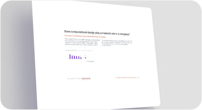 3/10/2018 2018 Design In Tech Report Does computational design play a material role in a company? As reported in Leah Buley's widely reviewed 2016 State of UX essay: When asked, "What measurable outcomes resulting from By contrast, one low-impact respondent answered, "We user experience are you most proud of?" high-impact are moving so fast there has been no time or resources respondents gave responses like: "Multimillion dollar for testing/outcomes – even for small usability increases in conversion and customer lifetime value." improvements." Leah Buley Co. State of UX 2016 Survey Ttho ewh folatlo wexinteg nmt heasas uyrour es?organization found UX to be a driver of Low impact Source: @leahbuley / Leah Buley Co. The State of UX in 2016 2018 Design In Tech Report | Technology × Business × Design 12 / 90 http://jmmbp001.local:5757/?ckcachecontrol=1520689902#16 12/90