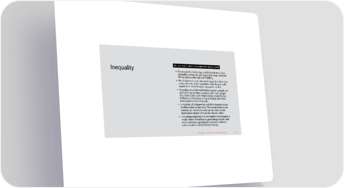 3/10/2018 2018 Design In Tech Report Inequality We can expect AI to only widen the digital divide It's easy in the technology world to look away from inequality becaus the privileges that come with tech life are pleasurable and self-fulfilling. But designers in tech can easily forget that they're in a tiny minority of the population that doesn't really match their much broader consumer market. So getting out of the tech bubble can be a simple yet powerful way to better connect with "real" people who don't really need what is being created today. Ultimately, it becomes a way to design and make better products for all people. A majority of designers in tech find themselves not working solely on premise. This means that we are entering an era where work can be more evenly distributed outside of hubs like Silicon Valley. Our design imperative at Automattic is to imagine a world where WordPress is good design for all. And we're currently exploring how remote work can achieve a new level of inclusive design. 2018 Design In Tech Report | Inequality & Skills Gap 66 / 90 http://jmmbp001.local:5757/?ckcachecontrol=1520689902#16 66/90