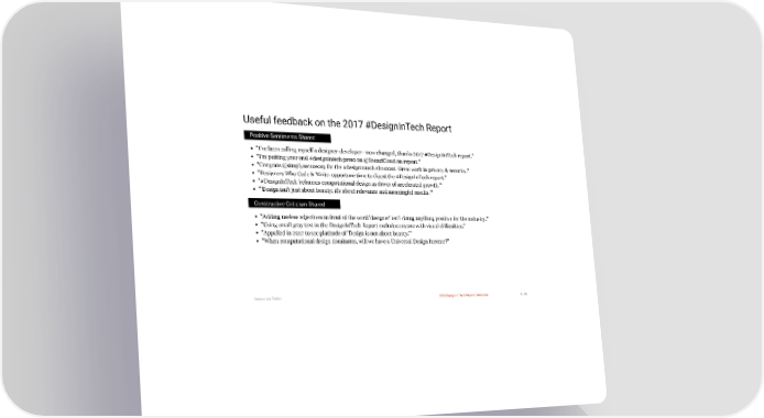 3/10/2018 2018 Design In Tech Report Useful feedback on the 2017 #DesignInTech Report Positive Sentiments Shared "I've been calling myself a designer-developer—now changed, thanks 2017 #DesignInTech report." "I'm putting your oral #designintech preso on @SoundCloud on repeat." "Congrats @simplysecureorg for the #designintech shoutout. Great work in privacy & security." "Designers Who Code & Write: opportune time to digest the #DesignInTech report." "#DesignInTech 'reframes computational design as driver of accelerated growth.'" "'Design isn't just about beauty; it's about relevance and meaningful results.'" Constructive Criticism Shared "Adding useless adjectives in front of the word 'designer' isn't doing anything positive for the industry." "Using small gray text in the DesignInTech Report excludes anyone with visual difficulties." "Appalled in 2017 to see platitude of 'Design is not about beauty.'" "When computational design dominates, will we have a Universal Design Income?" Source: via Twitter 2018 Design In Tech Report | Welcome 8 / 90 http://jmmbp001.local:5757/?ckcachecontrol=1520689902#16 8/90