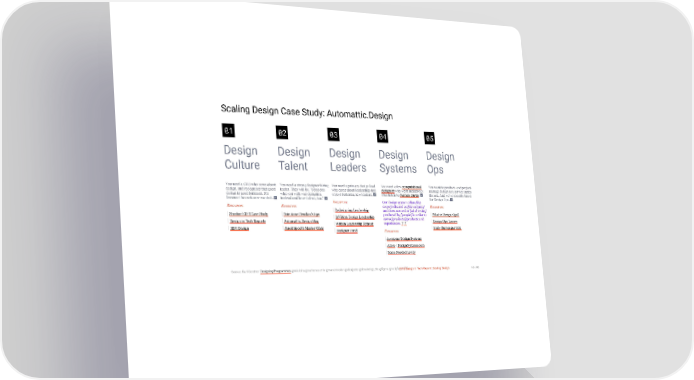 3/10/2018 2018 Design In Tech Report Scaling Design Case Study: Automattic.Design 01 02 03 04 05 Design Design Design Design Design Culture Talent Leaders Systems Ops You need a CEO who cares about You need a strong designer hiring You need a primary design lead You need a few computational You want to product- and project- design, and recognizes that good leader. They will be, "Someone who cares about leadership and designers who work inclusively. manage design as a service inside design is good business. It's who you wish was designing enjoys fostering new leaders. Plus listen to Nathan Curtis. the org. And we've recently hired because the customer wants it. instead and loves talent, too." Resources Our design system offers [kit for Design Ops. Resources Resources Redesigning Leadership scope] released as [kit outputs] Resources Stanford GSB Case Study Brie Anne Demkiw's tips and documented at [kit doc site] What is Design Ops? InVision Design Leadership produced by [people] in order to Design in Tech Reports Automattic.Design blog serve [products] products and Design Ops Lenses Within Leadership Retreat experiences. † †† IBM Design Jared Spool's Master Class Designer Fund Resources Holly Burroughs Cole Awesome Design Systems Adele | DesignSystems.com Some Needed Levity Source: Karl Gerstner Designing Programmes @mialoira @nathanacurtis @marcintreder @alexjpate @daveixd @_dte @figma @hollyface1975 2018 Design In Tech Report | Scaling Design 46 / 90 http://jmmbp001.local:5757/?ckcachecontrol=1520689902#16 46/90