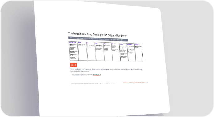3/10/2018 2018 Design In Tech Report The large consulting firms are the major M&A driver 21 new acquisitions of creative agencies or designer-founded startups noted in 2017. 2017 JAN - FEB MARCH MAY JUNE JULY AUGUST OCTOBER SEPTEMBER DECEMBER Idean acquired by JWalk acquired by The Monkeys and Market Gravity Maya acquired by Wire Stone Cooper acquired Matter acquired by Rothco acquired by Capgemini Shiseido Maud acquired by acquired by Deloitte BCG acquired by by Designit/Wipro Accenture Accenture Accenture Accenture Unity&Variety Intrepid acquired Clearhead Telepathy VLT Labs acquired acquired by by Accenture acquired by Acne acquired by acquired by by McKinsey & Co Salesforce Accenture Deloitte ServiceNow (CEO: John Donahoe) TandemSeven Sequence acquired acquired by by Salesforce Brand.ai acquired Genpact. by InVision Dribbble acquired by Tiny YARD acquired by Kyu Collective. DeviantArt acquired by Wix 2018 We’re excited to join Verizon in their quest to put customers in control of their connectivity and create breakthrough live and digital experiences. —Moment acquired by Verizon March 2018 Source: @tberno @jcoronado1 @leahbuley @hugosarrazin @randyjhunt @scootermcdoog @ezyjules @shatzygoespro 2018 Design In Tech Report | Technology × Business × Design 15 / 90 http://jmmbp001.local:5757/?ckcachecontrol=1520689902#16 15/90