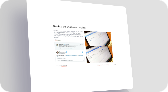 3/10/2018 2018 Design In Tech Report Bias in AI and who's auto-complete? Turkish uses the gender-neutral pronoun, "o." Yet, when the Turkish sentences "o bir doktor" (top) and "o bir hemşire" (bottom) are entered into Google Translate, they translate into English as "he is a doctor" and "she is a nurse." —Princeton John Maeda @johnmaeda 21 Oct Sara Wachter-Boettcher has created a concise case for digital product makers to work with a broader range of people. twitter.com/sara_ann_marie… daynagrayson @daynagrayson First place to start —> twitter.com/kmlake/status/… cc @kmlake @sara_ann_marie 11:40 AM - Oct 21, 2017 2 See daynagrayson's other Tweets Source: @google Fair Not Default 2018 Design In Tech Report | Inclusive Design 84 / 90 http://jmmbp001.local:5757/?ckcachecontrol=1520689902#16 84/90