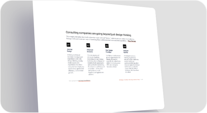 3/10/2018 2018 Design In Tech Report Consulting companies are going beyond just design thinking This complex discipline does itself a disservice to just call itself "design," which signals only surface-level solutions. Perhaps we’ll start to see new ways of describing these multifaceted and interconnected capabilities. —Hugo Sarrazin 01 02 03 04 Journey Advanced New Design Designer Design Analytics Paradigm Hybrids Infusing traditional The convergence of For design to inform new As designers are now customer (or employee) Advanced Analytics growth opportunities for working on problems experience work with (including AI) and Design clients, the need to relevant to the c-suite they design thinking to help is driving the confluence of quantify the value it can need to build core create spaces and insights (both quantitative achieve by having great analytical skills that allow experiences that drive and qualitative) informing DNA as a company them to equate their design consumer (or employee) the discovery and design of becomes critical. beliefs into quantifiable satisfaction, operational a solution – where data impact that can deliver efficiency, and revenue and creativity work business value have been growth. together, not against one- identified. another. Source: @hugosarrazin Good Design Is Good Business 2018 Design In Tech Report | Technology × Business × Design 18 / 90 http://jmmbp001.local:5757/?ckcachecontrol=1520689902#16 18/90