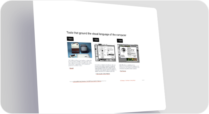 3/10/2018 2018 Design In Tech Report Tools that ground the visual language of the computer 1981 1984 1989 The Paintbox package came together complete with its own disc store and library management. At that time a big hard drive held 70 megabytes on 14-inch platters that occupied about 4RU, took loads of MacPaint was written by Bill Atkinson, who was a Adobe Photoshop 1.0 minimum system power and cost about £5000. member of the original Macintosh development requirements are hard disk and 2 megabytes RAM. —Quantel team. He based it on his earlier LisaSketch (also A gray-scale or color monitor is recommended, and called SketchPad) for the unsuccessful Apple Lisa a Macintosh compatible scanner is optional. computer, so he originally called it MacSketch. He —First Versions started work on the Mac version in early 1983. —The Computer History Museum Source: A. Michael Noll Using Photoshop 1.0 in 2015 Source Code for Photoshop @winworldpc 2018 Design In Tech Report | Scaling Design 38 / 90 http://jmmbp001.local:5757/?ckcachecontrol=1520689902#16 38/90