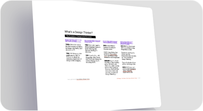 3/10/2018 2018 Design In Tech Report What's a Design Thinker? The Evolution of Design in the Enterprise BIRTH OF TRADITIONAL DESIGN FOR LARGE BIRTH OF MODERN PRODUCT DESIGN FIRMS / BIRTH OF "DESIGN THINKING" AND DESIGN "DESIGN THINKING" MAINSTREAMS AS CORPORATIONS / CORPORATE FROM TRADITIONAL DESIGN, TO DESIGN OF STRATEGY / HARNESSING THE CREATIVE WHOLE BUSINESS STRATEGY / RE- IDENTITY+IMAGE AND PRODUCT STYLING SYSTEMS+SERVICES PROBLEM SOLVING SKILLS OF DESIGNERS CONTEXTUALIZING DESIGN, MAKING B- SCHOOLS INTO D-SCHOOLS 1950s GM’s CEO makes 1982 From 1982 Apple’s 2005 Hasso Plattner 2015-16 Phil Gilbert leads the first executive position design language begins to Institute of Design at IBM’s $100M bet to bring in design with Harley Earl form with frog and Stanford starts. design back to IBM. elevated to VP. Hartmut Esslinger’s direction. IDEO's Jane Fulton Suri Tim Brown and Roger L. 1966 IBM Memo to IBM publishes Thoughtless Martin open the employees by CEO TJ 1991 David Kelley, Bill Acts? and brings design introductory issue for HBR Watson Jr. about the Moggridge, Mike Nutall research to the foreground. on “The Evolution of emerging importance of join forces and change the Design Thinking.” design to the company. course of design by co- 2008-09 Roger L. Martin founding IDEO. describes design thinking Top 10 B-schools all have at the CEO level with student-led design clubs. P&G’s AG Laffley and his 2018 IBM Design open book on The Design of sources their Enterprise Business. (SAP and P&G Design Thinking were a few of the early framework for all. executive adopters of Design Thinking.) Source: @librariobabel Good definition of design thinking 2018 Design In Tech Report | Technology × Business × Design 14 / 90 http://jmmbp001.local:5757/?ckcachecontrol=1520689902#16 14/90