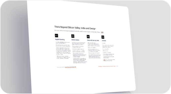 3/10/2018 2018 Design In Tech Report Think Beyond Silicon Valley: India and Design By 2050, India’s economy is projected to be the world’s second largest, behind only China. —WEF 01 02 03 04 English Speaking Mobile Culture China with (not vs) India JUGAAD 125 million English speakers, second India has the second largest installed China and India make a In Hindi, only to the United States. base of smartphones in the world complementary combination of Oral tradition where narrative is the behind China of ~300 million. machine power and human power: “overcoming harsh constraints by primary mode of culture propagation. Basic smartphone handsets are China - Products / India - Services. improvising an effective solution available at below $50 They're giant neighbors. using limited resources”. India is a pluralistic society, secular and incredibly diverse. Multi-ethnic Monthly data plan for under $2 Each has a population of over a (a.k.a. "the MVP") Art & Craft tradition with local idioms People in India spent ~150 billion billion (they collectively account for Thrift not waste. marking design sensibilities. * Strictly hours on Android devices in 2016 36.3% of the world's people). speaking, there is no such thing as a They anchor the "rise of the rest." Inclusion, not exclusion. unified "Indian" culture-it's identified 70% of Indians consider local Bottom-up participation, not top- by region / state. language (22 official local languages) Each touts its style of governance as down command and control. Differing in Cuisine, Language, digital content more reliable than opposed to that of the other: China, Performing arts, Apparel, Customs, content in English with its authoritarian efficiency; Flexible thinking and action, not Music, Literature, Architecture, … 9 out of 10 users coming online are India, with its democratic vibrancy. linear planning. not proficient in English, but adapt HBR (2010) / Ravi Radjou, Jaideep anyways. Many use the English Prabhu, and Simone Ahuja keyboard -- not bothering to switch to the script of their native language Source: @sunilmalhotra Indian Express Quartz Recode HBR 2018 Design In Tech Report | Technology × Business × Design 23 / 90 http://jmmbp001.local:5757/?ckcachecontrol=1520689902#16 23/90